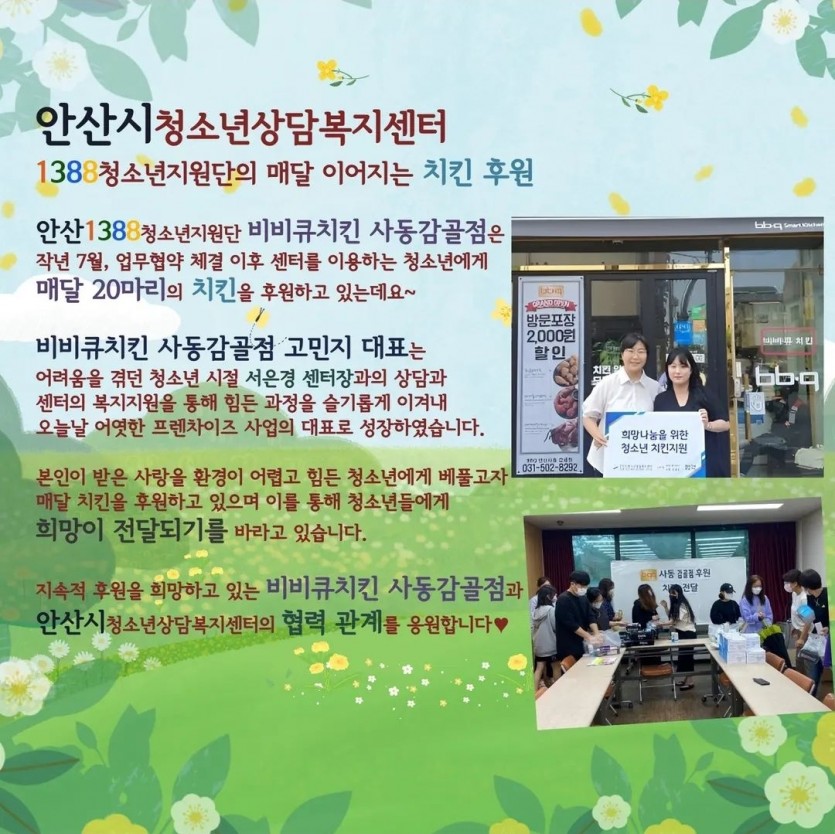 매달 치킨을 후원해주시는 비비큐치킨 사동감골점 내용이 경기도청소년상담복지센터에서 나오는 1388청소년지원단 소식지에 실렸습니다.