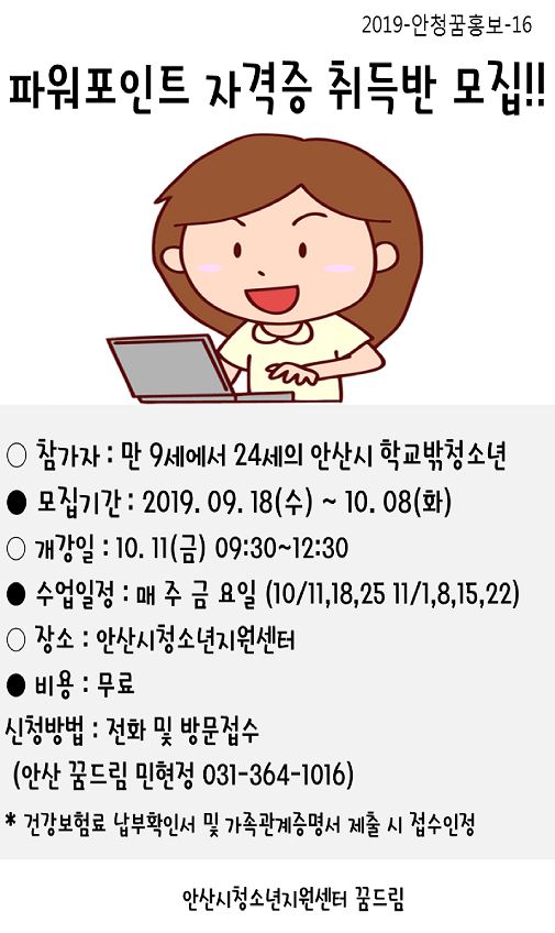 안산시청소년지원센터 꿈드림에서 파워포인트 자격증 취득반에 참여할 친구를 모집합니다.