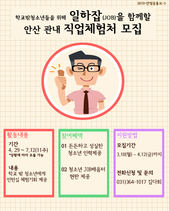 안산시 학교밖청소년들에게 직장체험(인턴십)의 기회를 제공해주실 사업주님들을 모집합니다.